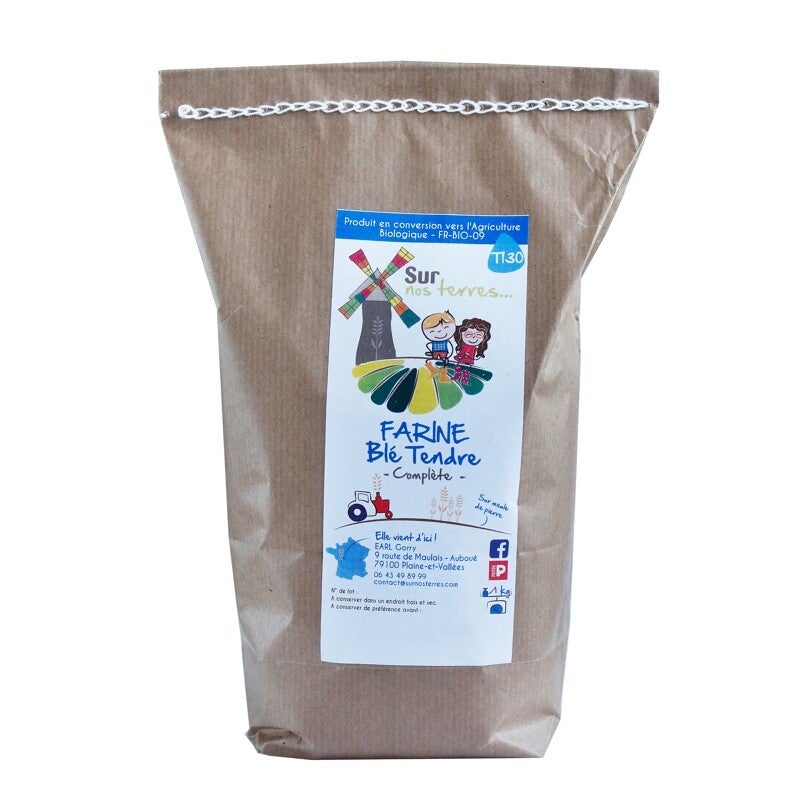 Farine de blé tendre* complète (T130), riche en fibres et en minéraux, fraîchement moulue sur notre moulin à meule de pierre.